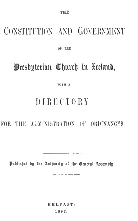 IMAGE: Title page of The Constitution and Government of the Presbyterian Church in Ireland, with a Directory for the Administration of Ordinances, Belfast, 1887.