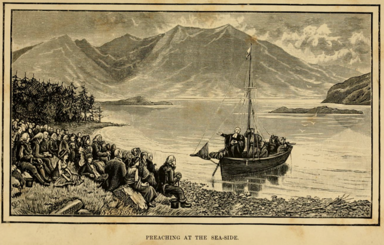 After "The Disruption," those congregations who had joined the Free Church had to build new churches. The Image shows a minister of the Free Church preaching in the open air to his congregation assembled on the shore. Brown, commenting on the difficulties of the Free Church, clearly seeks to tie its circumstances in to the history of the early Christian Church and, in so doing, recalls the persecution of the Scottish Covenanters. He says: “Many a time under those lowly roofs, or out on those bare hillsides, men's thoughts went back to the days of persecution when our covenanting forefathers met for the worship of God amid the glens and moors of our native land, or to scenes associated with memories more sacred still — the river-side at Philippi, where prayer was wont to be made — the boat floating on the Sea of Galilee, out of which One spake as man never spake — or the lonely desert which the presence of God turned into a Bethel, the very gate of heaven.”