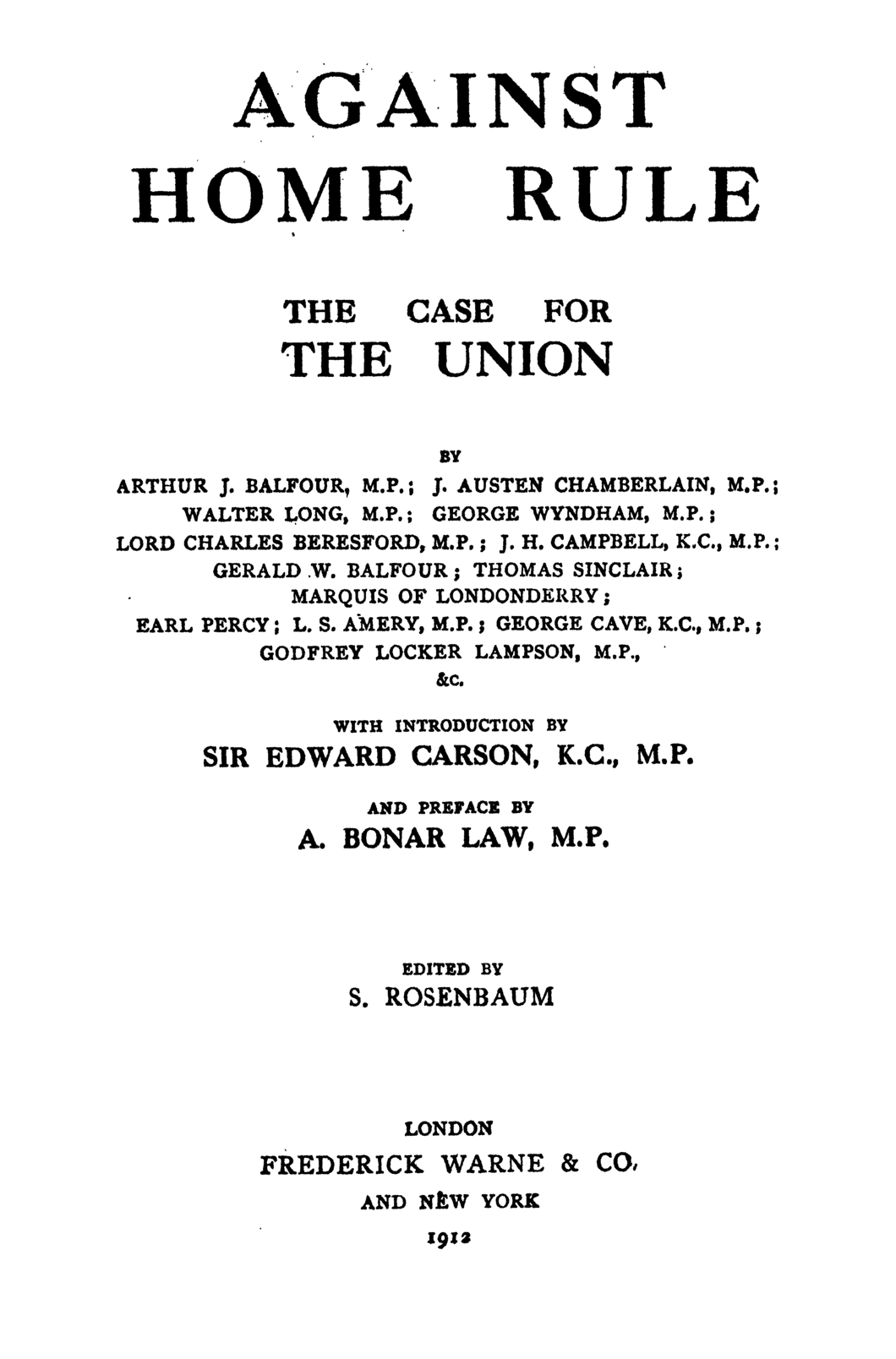 IMAGE: Title Page of S. Rosenbaum (ed.), Against Home Rule, The Case For the Union, London and New York, Frederick Warne & Co., 1912.