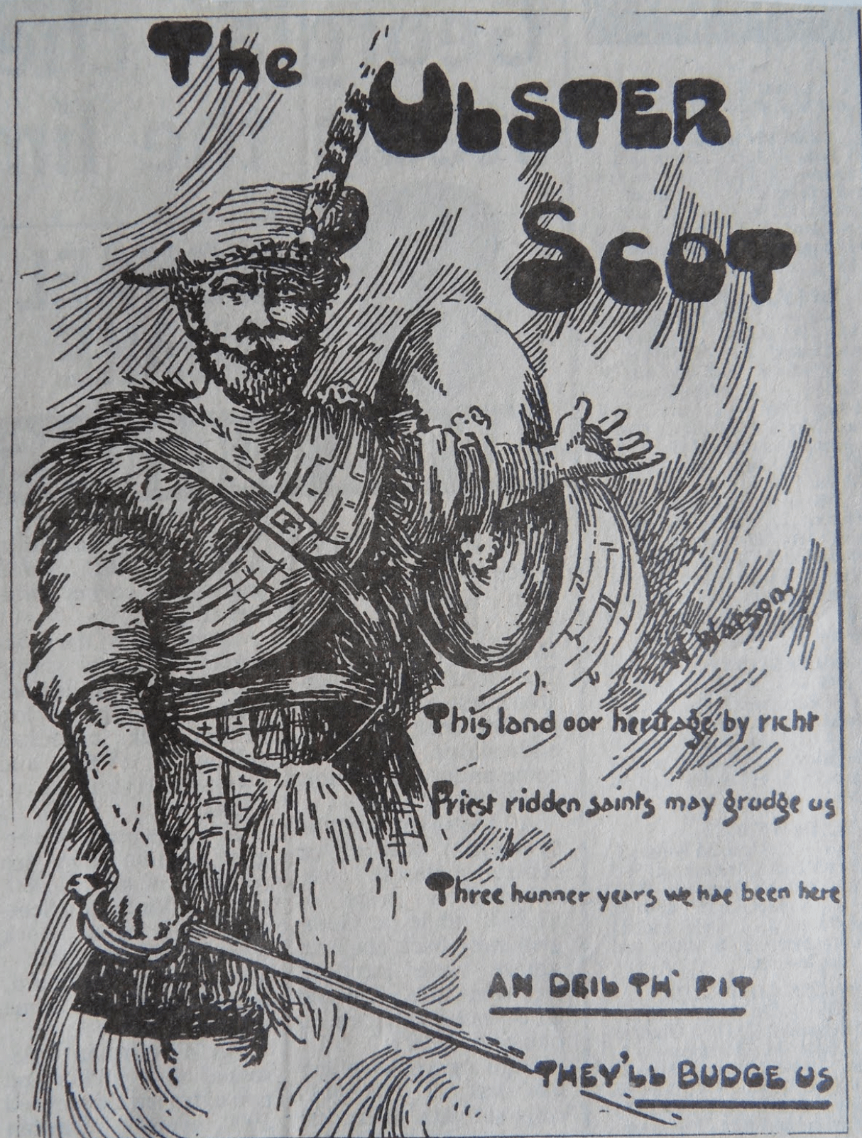 In any case, it is striking that when Carson refers to the Ulster Scot, he makes no attempt to explain what he means. It is clear that, by 1912, the “idea” of the Ulster Scot had become sufficiently clear in the popular imagination for him to be able to call on this figure without fear of ambiguity. When he asks his rhetorical question - “Do you really think that the Ulster Scot is the kind of man you can trample underfoot?” - Carson knows that the MPs will understand that the Ulster Scot he is referring to is a by-word for dogged resistance. As the unionist postcard, “The Ulster Scot,” puts it: “This land oor heritage by richt [...] Three hunner years we hae been here, An deil th’ fit they’ll budge us.”