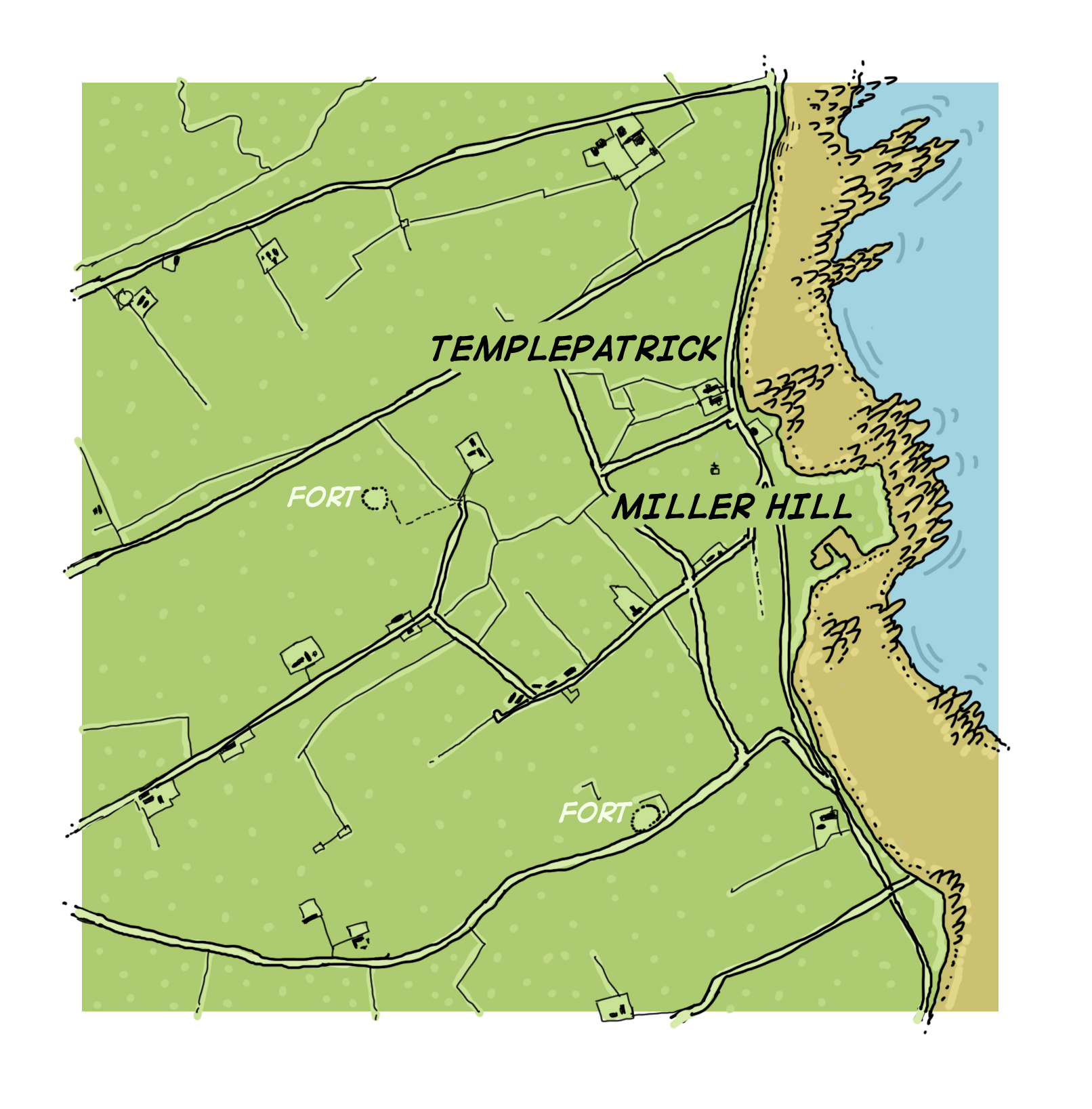 Two miles south from Donaghadee, on the shore road into the Upper Ards, that narrow peninsula between Strangford Lough and the Irish Sea, there lies a little enclosure which must arrest the stranger’s attention. It is a graveyard, and is called Templepatrick. It is surrounded by low stone walls; no church or temple is now within its confines; no trees or flowers give grateful shade, or lend colour and tender interest; it is thickly covered with green mounds, and with monumental slabs of grey slaty stone, — the graves are packed close together. Read the simple “headstones,” and you discover no trace of sentiment, few fond and loving words; no request for the prayers of the passer-by for the souls of those who sleep below; nothing more akin to sentiment than “Sacred to the memory of.” [...] Read the names on the stones [… ] The names are very Scottish — such as Andrew Byers, John Shaw, Thomas M’Millan, Robert Angus; it is a burying-place of the simple peasants of County Down, who are still, in the end of the nineteenth century, as Scottish as they were when they landed here nearly three centuries ago. (Harrison, pp. 13-14)