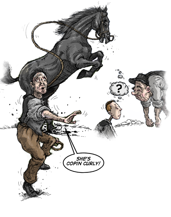 (2) “Coup” or “cowp” in Ulster-Scots means to overturn, to upset. The expression “copin’ curly” means to turn head over heals, to do somersaults. Here, it would mean something like “jumping around wildly.”
